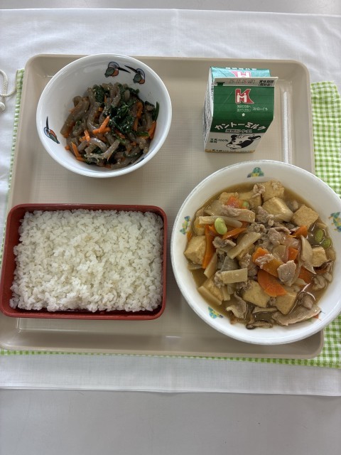 麦ごはん、生揚げのうま煮、こんにゃくのごま和えです。