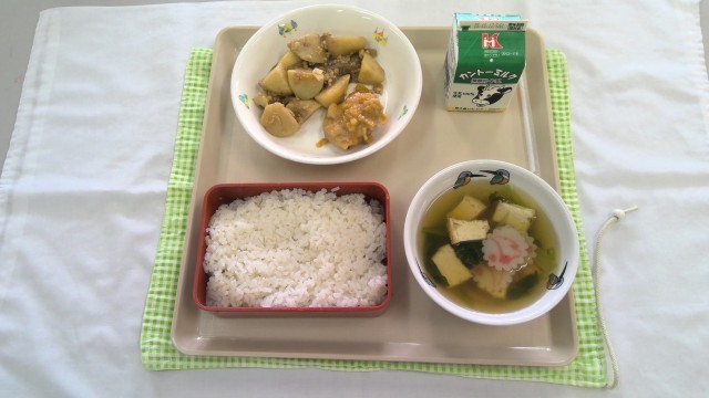 本日のメニューは、里芋のそぼろ煮、鶏肉のみそ焼き、お月見汁です。