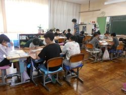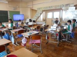 2校時、5年2組は国語です。課題は、「計画をもとにグループで話し合い、振り返ろう」グループの話合いをタブレットで録画しながら進めます。話し方や資料の見せ方などを、確認していました。話合いの題材は「授業を活発な雰囲気にするためには?」話合いの中で、授業を楽しくするためにどうしようかと話し合うグループがありました。5校時、5年1組は社会です。課題は「食生活の変化は、食料自給にどのような影響がある?」食料自給率の変化について、2つのグラフをもとに、グループの意見をまとめていました。米の自給率や輸入物の変化などをもとにして、新しい気付きを得ようと熱心に話し合いました。