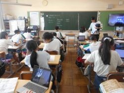 5校時、6年2組は社会です。本時の課題は、「修学旅行で学んだことを新聞にしよう」掲載する内容、紙面構成、タイトルに使う飾りの文字など、自分で考えたり、仲間に相談したりしながら集中して取り組んでいました。タブレットを用いて、内容を確認しながら新聞を作成していました。何を学んだのか、振り返るよい機会となっています。