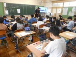 5校時、5年1組は理科です。本時の課題は「流れる場所において、川の様子にはどのような違いがあるのだろう?」流れる川の速さ、周りの環境を、上流・中流・下流ごとに、タブレットの映像資料を用いて調べました。皆、映像資料に夢中です。周りの仲間と相談しながら、分かった内容をワークシートにまとめていました。