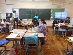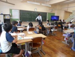 2校時、5年1組は書写の時間を使って、「対話型鑑賞」を行いました。先生が提示した美術作品(牛久市出身の小川芋銭の絵)について、①見えたものについて発表②何をしているのか③どんな声や音が聞こえるか④タイトルについてなどを、思い思いに発表しました。どんどん考えが出るので感心しました。5年2組は、算数です。課題は、「大きさの等しい分数のきまりとは?」4分の3と大きさの等しい分数について、グループで考察をしました。かけ算やわり算を使って、きまりを考えます。それぞれのグループの考えを聴き、最後はグループでまとめを行いました。自分たちで考え、まとめまで進めた意欲的な活動が大変よかったです。