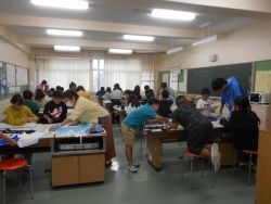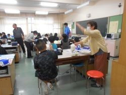 5,6校時、5年2組は家庭科です。本時の課題は、「エプロンを長く使えるようにつくるには?」地域から4名のボランティアの先生をお招きして、エプロン制作に取り掛かります。購入したエプロンキットの中身、手順の確認を終えると、いよいよ生地を切っていきます。ボランティア先生に布を押さえていただいたり、はさみの使い方を教えていただいたりしながら、後半にはミシンを使うところまで進みました。早く完成したエプロンを使って、活動する姿を見たいです。