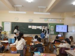 3校時、2年2組は算数です。本時の課題は、「どの形を使えばいいかな?」図形の単元で、様々な三角形や四角形を使って、ロケット、家、魚などをつくりました。次に思い思いの図形を用いて、一つの作品を考えました。2年生では、具体物を用いた活動を通して、図形についての理解の基礎となる経験を重ね、図形についての感覚を豊かにするのが目標です。大小さまざまな形の三角形や四角形などを使って、どのように仕上げるか、熱心に考えていました。「へんなかたちのちょうちょ」「きれいなうみ」などのタイトルをつけて、提示しました。