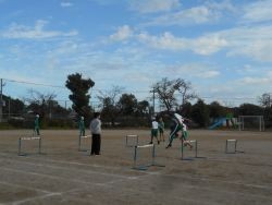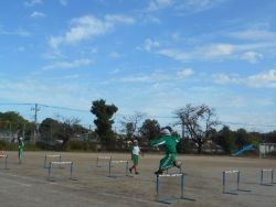 1校時、5年1組は体育です。本時は、ハードル走のまとめを行っていました。3レーンある中で、手前では先生がタイムを計ります。残り2レーンは練習用です。歩数や踏切などを確認しながら、何度も試していました。運動会は終わりましたが、走ることを楽しんで練習に励んでいました。