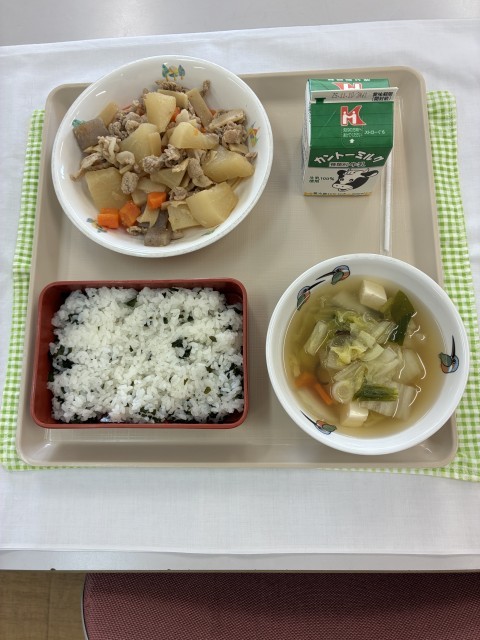 本日のメニューは、わかめごはん、塩麹スープ、豚肉と大根のうま煮です。