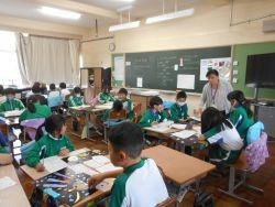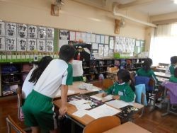3校時、4年1組は図工です。本時の課題は「友達の作品のよいところを見つけよう」台紙にキラキラの紙を貼って花火や宇宙などのデザイン画を完成させました。本日は鑑賞の時間です。まず、自分の工夫した点やうまくいった点などを考えます。次に4人グループで、よいところを伝えあいました。よいところを具体的に伝えるのは難しさもありますが、自分の言葉で考えて伝える国語の学習も含まれます。仲間の意見を聴いて、表現の幅を広げる機会になるとよいと思いました。最後に、学級の仲間の作品を観て、すばらしい作品には多くの児童が集まっていました。