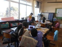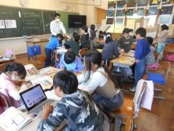 5校時、3年1組は理科です。本時の課題は「虫眼鏡で日光を集めてみよう」虫眼鏡を使って、日光を紙の1点に集めます。焦げたり、煙が出たりするのを期待しましたが、中々思うようにいきません。しかし、粘り強く角度を変えたり、虫眼鏡の位置を近づけたりしながら挑戦していました。3年2組は社会、「(取手)かるたを作ろう」6グループに分かれて、作り終えた2グループはかるた取りを行っていました。まだ終わらないグループは、協力しながら読み札の作成をしていました。文言を考えるのが、少し難しいようでしたが、仲間と相談しながら熱心に取り組んでいました。