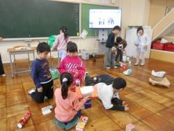 1校時、1年1組は生活科です。本時は、球根を植えました。春に咲く花、ムスカリやチューリップ、フリージアなど家から持ってきた球根を一生懸命に植えます。「球根は皮を取ったほうがいいですか?」との質問に、先生と一緒に考えて、そのまま植えることにしました。1年生が2年生になる、来年の4月ごろにはきれいな花が咲く予定です。4校時、1年2組は算数です。本時の課題は、「かたちあそび」です。様々な形、大きさの空き箱などを使って、いろいろな形をつくっていました。グループの仲間と高く積み上げたり、何かに例えたりするなどして、熱心に取り組んでいました。