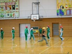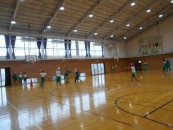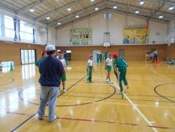 4校時、5年2組は体育です。課題は「試合の難しいところは、どんなこと?」ハンドボールに挑戦していました。3人組で行いました。パス回しも速く、ゴールも迫力があります。ゴールキーパーはいないので、全員が攻めて全員が守ります。守備も上手で、何度もゴールを阻止されたグループもありました。キビキビと動き、気持ちよくプレーしていました。