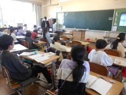 3校時、3年2組は国語です。「モチモチの木」を読んで、主人公豆太の変容について考えを聴き合いました。「豆太は変わった?変わらない?」に対して、自分の考えをもとに、グループの仲間と熱心に協議します。全体発表の中で、変わった理由の根拠となる教科書のページ数が述べられると、サッと教科書を開いて確認する姿も見られました。どの児童もしっかりとした自分の考えをもって話し合っていたのが、とてもよかったです。4校時、3年1組は算数です。小数を使った文章問題に挑戦しました。全体で大事な言葉を確認すると、自分の考えをノートに書きます。先生は、代表的な考えをモニターに映して全体で考えを共有しました。仲間の考えを代わりに発表する児童もいました。子ども達は、仲間が考えた多様な解き方に触れて考えを広げました。