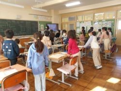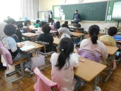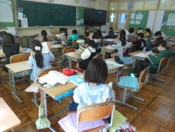 4校時、2年2組は算数です。本時の課題は「8の段の九九をつくろう」ノートに8の段の九九を書き終わると、ペアになって質問と答えを言い合って覚えます。終わるとすぐに次のペアを探して練習します。順番に言う子もいれば、ランダムに言う子もいて、一生懸命に練習します。何度も繰り返して、しっかり覚えようとしていました。2年1組は国語です。課題は、「どんなところがおもしろいかな?」たくさんの昔話の絵本が置いてあります。これからの授業で選んだ昔話を紹介するカードをつくります。全員違う話について書くようで、お気に入りの作品を選ぶのに、どんどん絵本を読み進めています。読書記録カードには、300冊以上読んだ記録がある子もいました。真剣に昔話を読む姿が、とてもよかったです。