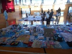 体育館は、明日のふれあいバザーに備えて、たくさんの品物が並べられています。バザーは明日の10時から、体育館で行います。担当の皆様のおかげで、バザーの準備万端です。ぜひお越しください!