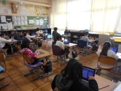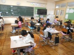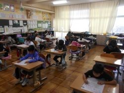 1校時、2年2組は算数のテストです。たしかめ問題にチャレンジしました。今までの復習になるので忘れてしまった内容もあったかもしれませんが、静かに、時間いっぱいまでよく考えていました。名前や文字、数字を丁寧に書いているのが、大変よいところです。筆算で線を引く時には、定規を使ってきちんと線を引く子が多いのも、とてもすばらしいです。テストが終わったら、タブレットでかけ算九九の練習をして、最後まで熱心に学びました。
