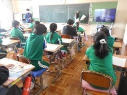 2校時、5年2組は算数です。学力診断テストの振り返りを行いました。分数や計算式について考えました。黒板を使って考え方を説明し、終わると自然に拍手が出ます。仲間が書いた式について説明をした子もいました。何度も繰り返して考えることで、知識の定着を図ります。積極的に説明をする意欲と、熱心に聴こうとする態度がよかったです。