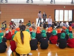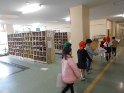 3・4校時、1年生は近所の幼稚園、保育所の年長さんと交流会です。会の進行、年長さんに校内案内や説明などを行いました。1年生も年長さんも、始めは少し緊張気味でしたが、一緒に校内を回るうちに打ち解けてきました。理科室や家庭科室、校長室などを案内し、しっかりと説明しました。「こっちに集まって」「並んでください」など、分かりやすく指示を出しながら動く姿が頼もしかったです。お別れの前に、自分たちでつくったメダルを年長さんにプレゼントしました。来月は幼稚園で交流会を行います。