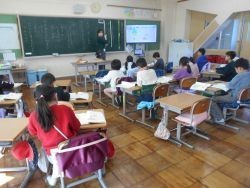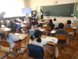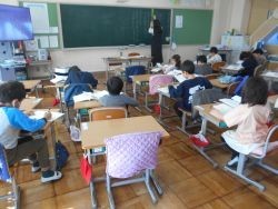 3校時、1年2組は国語です。まず、回文(上から読んでも下から読んでも同じ音のことば、文)を学びます。身近なトマト、しんぶんし、などをたくさん考えて発表しました。課題は「ことばあそびクイズをしよう」課題をノートに書くと、正しく書けたかお互いに確認です。テンポよくすすみました。クイズをつくることにワクワクしながら、活動に取り組みました。1年1組も国語です。課題は「大アリクイとコチドリの違うところと同じところは、どこだろう?」読み取りの活動です。ワークシートに答えを書きますが、説明文なので少し苦戦する子もいます。仲間の発表をよく聴きながら、教科書を見て、自分の考えと比べていました。自分の考えを堂々と発表する子が多かったです。