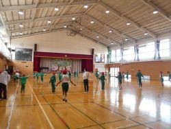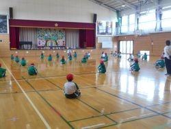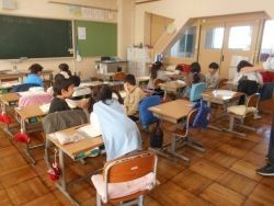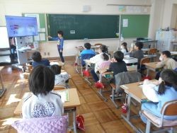 2校時、1年1組は算数です。問題は、「おりがみはぜんぶでなんまいかな」10のまとまりを使って、計算することを学びます。「30+20=50」の計算を「3+2=5」と考えるとき、どう考えたのかを説明します。教室では、ミニティーチャーが黒板やモニターを使って説明します。何人もの子が挑戦します。最後に、「10をまとまりとして考える」というキーワードが出て、納得の笑顔が出ました。まとめの問題は「もっと難しくしてほしい」など意欲的な言葉が聞かれました。4校時、1年生は学年体育です。なわとびに挑戦しています。1年生は話の聴き方も上手なので、コツをつかむのも上手です。時間いっぱい、がんばって挑戦する姿が見られました。