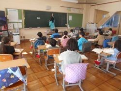 4校時、1年1組は国語です。課題は「どんな出来事があったかな?」小学校のことを紹介する活動です。先生からの問いかけに対する返事や反応がとてもよいです。音読も、以前よりはっきりと大きな声で上手に読めるようになりました。1年間を振り返り、何が楽しかったか、思い出に残ったかを考えていきます。「校外学習」や「運動会」「シャボン玉も楽しかったな」と、皆それぞれ考えを広げていました。
