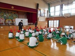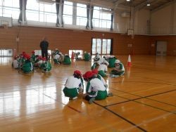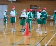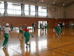 4校時、4年生は体育です。種目はハンドボールです。本時の課題は「ゴールを決める、決められないためにどうしたらよいか考えよう」まず、チームごとにパスの確認です。本時からゲーム開始で、子ども達のテンションもあがります。チームごとに作戦会議をすると、対戦相手・試合順・審判の確認をしてゲームがスタートしました。基本的に1組対2組の戦いです。各チームとも作戦会議の効果もあり、全員が考えながら動いています。指示を出す人もいて、本格的なゲーム展開となりました。