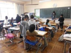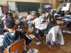 3校時、3年1組は書写です。本時は、1年間のまとめで「水」の清書です。特に「はらい」や「はね」に気を付けて書くのが目標です。本日は提出もありますので、いつも以上に真剣です。自分の思うように書けない部分もあり、納得できる作品を仕上げようと一生懸命に取り組みました。静かな時間が流れていました。2組は国語です。課題は「くわしく分かりやすく相手に伝えるには?」まず、主語と述語を確認しました。続いて、詳しく伝える語や部分を選びます。なぜそうなるのか、仲間と話し合いながら考えます。発表に対して「自分も同じ」「違うな~」などのつぶやきも出ます。最後に、文の作成をしながら考えます。生き生きと活動する姿が印象的でした。