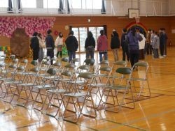 3校時、6年生は体育館で「卒業式」で歌う歌の練習です。「旅立ちの日に」を練習していました。最初は、パートごとに丸くなって練習。次いで、お互いの歌を聴きあいました。最後に、本番と同じように全体で歌いました。伸びやかな声が、きれいに揃うようになってきました。