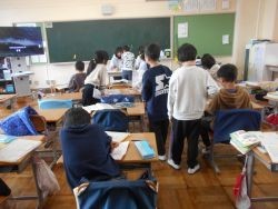 3校時、1年2組は算数です。1年間の復習問題に挑戦しました。少し難しい問題にも、集中して取り組みました。1年1組は、国語です。テストの見直しが終わったら、読書カードのまとめです。今までの読書記録を見て、1年間を振り返る様子がありました。どちらのクラスも熱心に学びに励む子ども達の姿がありました。