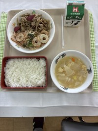 本日の給食は、豚肉とごぼうのしぐれ煮、小松菜のおかかマヨネーズ和え、打豆汁です。