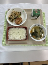 本日のメニューは、のりずあえ、鶏肉のからあげ、ごまみそ汁です。