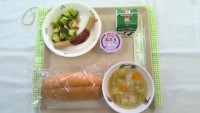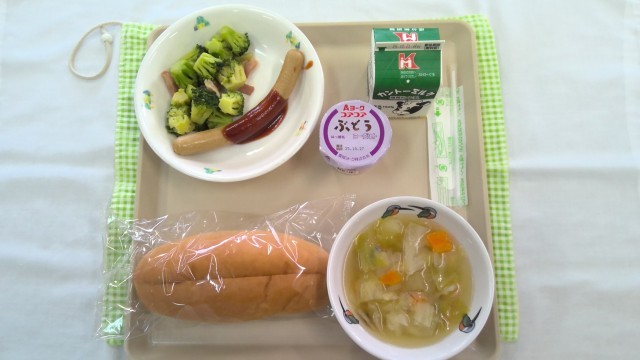 本日のメニューは、ブロッコリーのガーリックソテー、コッペパン、フランクフルト、ABCスープ、ヨーグルトです。