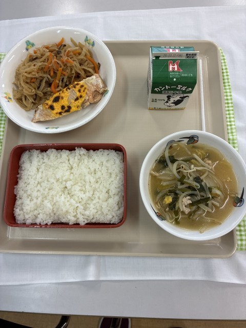 本日の給食は、鮭の紅葉焼き、切干し大根の煮物、キムチみそ汁です。