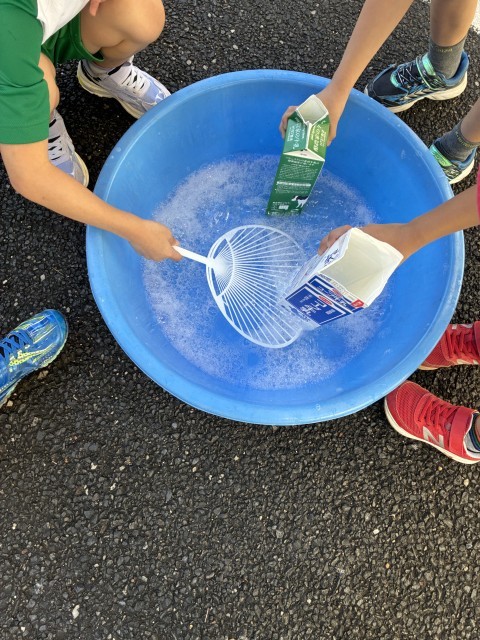 1年生、生活科の授業の様子です。お天気にも恵まれた今日は、みんなでたくさんのシャボン玉を飛ばしました。うちわ、牛乳パックなどなど様々な道具を使って大小様々なシャボン玉を作りました。舞い上がるシャボン玉...
