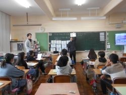 4校時、1年1組は算数です。「ねこは何匹のっているかな?」という問題を、式に表していました。2種類の式が出て、どう考えたかをブロックを使って説明しました。何人も手を挙げて、考えを仲間に伝えます。発表...