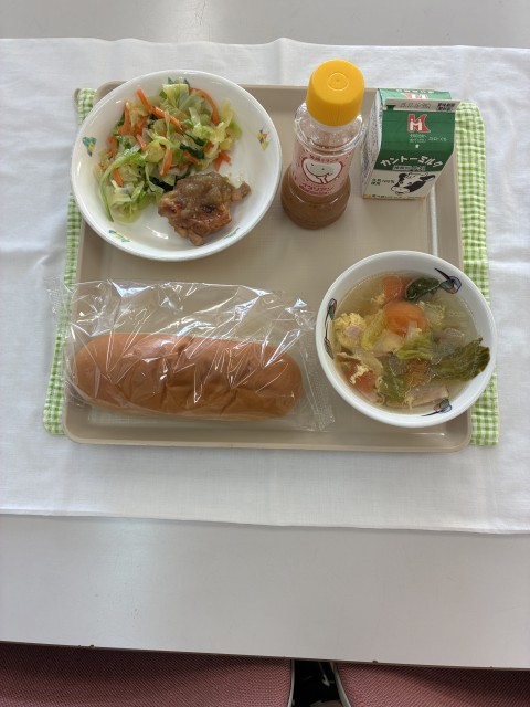 今日のメニューは、ミルクパン、ルッコラ入りサラダ、鶏肉のバーベキューソース、トマトと卵のスープです。
