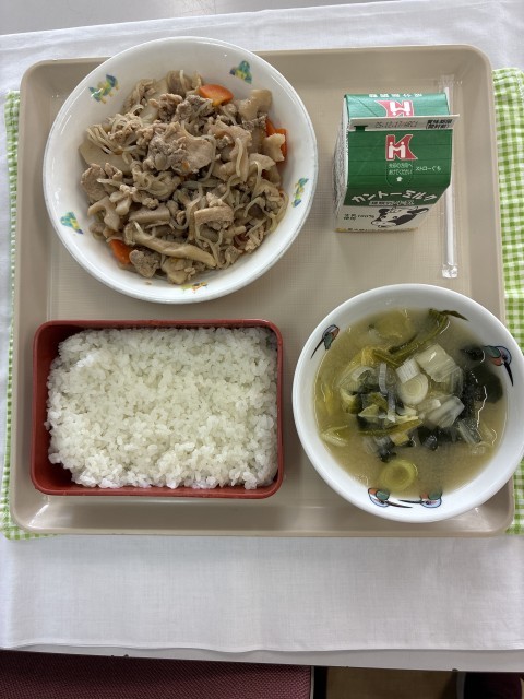 本日の給食は、豚肉とれんこんの炒め物、みそ汁です。