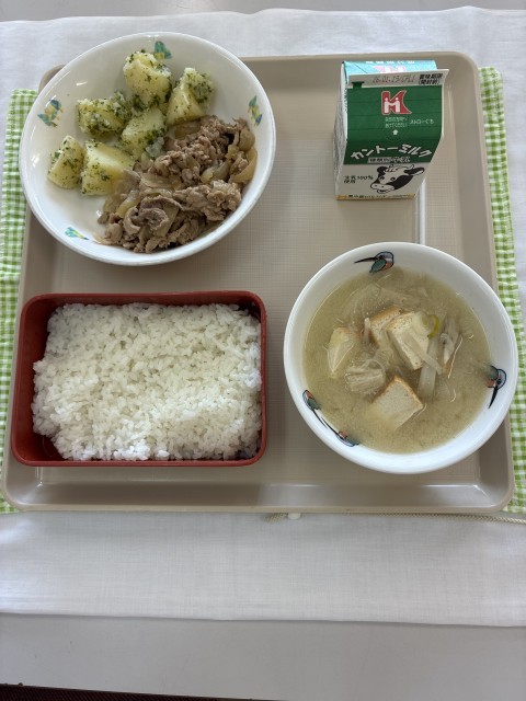 本日の給食は、豚肉のしょうが炒め、のり塩じゃがいも、豆乳みそ汁です。