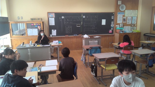 1組は国語の時間でした。漢字の書き取りをしました。2組は算数の時間でした。少人数で分数の計算をやりました。