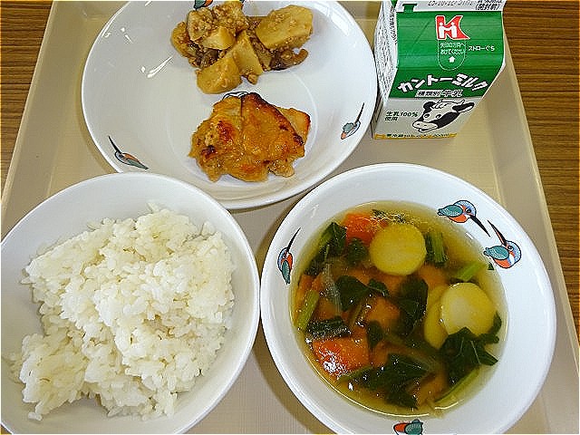 【10/6給食紹介】お月見献立 公開日 2025/10/07 更新日 2025/10/06 お知らせ 今日の給食は「麦ごはん 牛乳 鶏肉のみそ焼き 里芋のそぼろ煮 お月見汁」です。今日は十五夜です。芋名月ともいい、収穫した里芋をお供えする地域もあります。給食では里芋をそぼろ煮にしました。