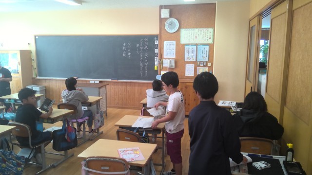 1組は算数の時間でした。円の面積の公式のしくみについて、各自で考えていました。2組は書道の時間でした。「中秋の名月」という文字を書いていました。2つのクラスとも落ち着いていました。