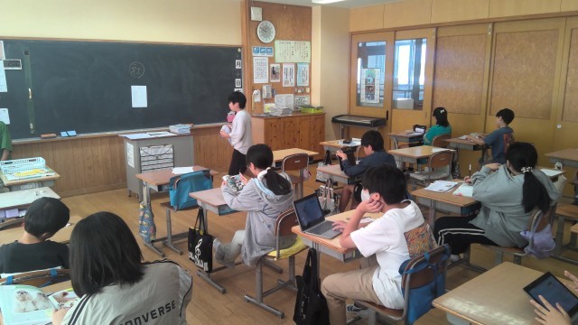 1組は外国語の授業でした。「Don't say ピーマン You say green pepper」など日本語と英語で間違えやすい表現について学習しました。2組は課題が終わって、それぞれ自習やタブレットをやっていました。