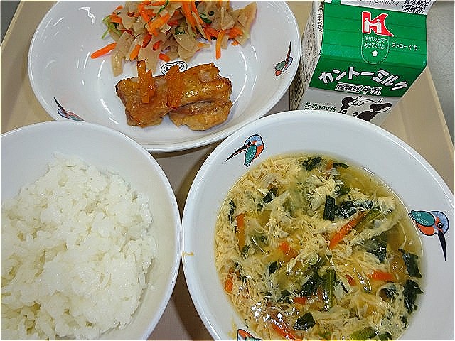 今日の給食は、「ごはん 牛乳 鶏肉のマーマレード焼き れんこんサラダ かきたま汁」です。