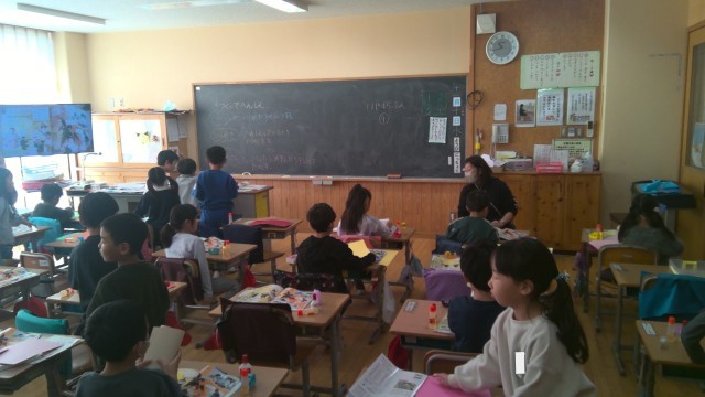 【1年生・地域とともにある学校】3時間目の様子 公開日 2025/12/10 更新日 2025/12/10 1年生 3時間目は図画工作科の時間でした。色画用紙を使って、様々な創作活動を行いました。地域のボランティアの方にも来ていただきました。