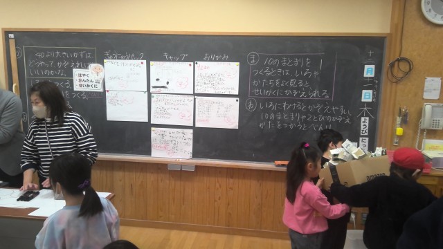 2時間目は算数の授業でした。教員の授業力向上に向けて、市教育委員会より指導主事を講師としてお招きして、研究授業を行いました。児童たちは50以上あるキャップや折り紙などを、どのようにすれば正確かつ早く数えることができるかを、既習内容を踏まえて考えることができました。