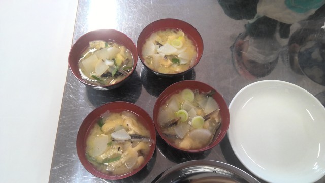 1組は家庭科の時間でした。みそ汁をつくり、鍋でご飯を炊きました。特にみそ汁は煮干しからだしを取るなど本格的でした。2組は体育の授業でした。寒い中でしたが意欲的に活動していました。