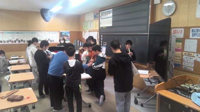 1組は理科の時間でした。「私たちの生活と電気」という単元で、身の回りの電気の利用方法等について学習しました。2組は音楽の時間でした。リコーダーを使って一生懸命演奏をしていました。