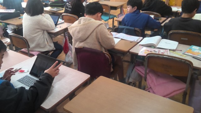 1時間目は算数の時間でした。分数の掛け算について学習しました。授業の最後は各自タブレットやワークを使って自主学習をしていました。