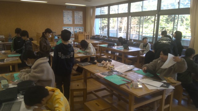 1組が図画工作科の授業でした。彫刻刀を使って版画を作成してしています。ボランティアの方に来ていただいています。2組は外国語の事案でした。日本のそれぞれの地方の特色について英語で答える活動を行いました。
