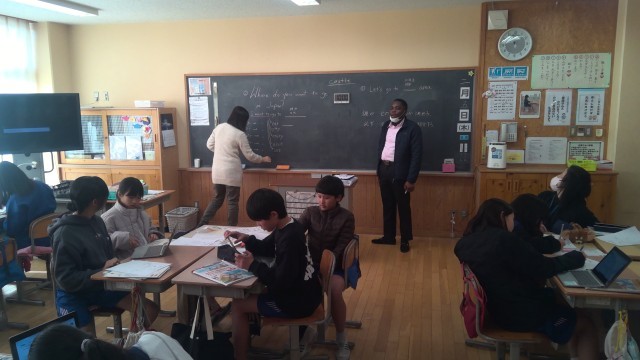 1組は家庭科の時間でした。エプロンを作成していました。ボランティアの方にも来ていただきました。2組は外国語の時間でした。「Where do you want to go」などの疑問文について学習しました。