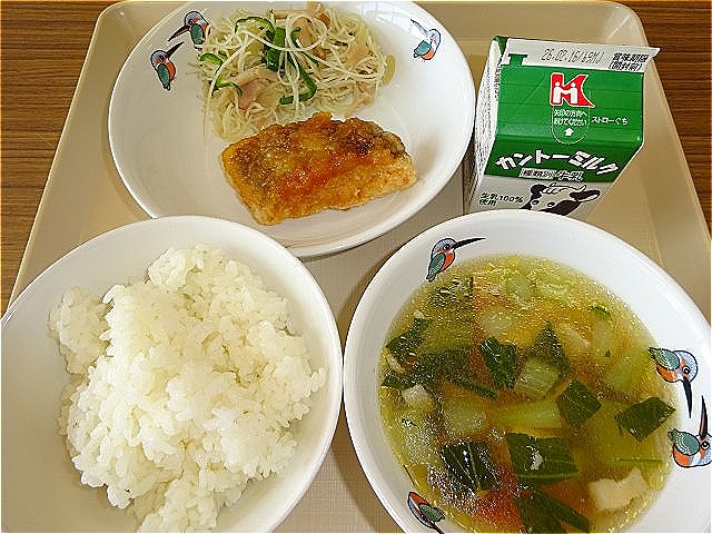 今日の献立は、「ごはん、牛乳、白身魚の香味ソースかけ、ビーフン炒め、チンゲン菜のスープ」です。