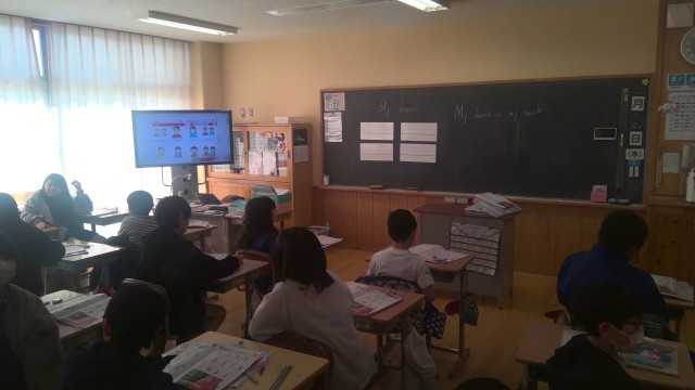 1組は家庭科でした。ミシンを使って創作活動をしました。ボランティアの方にもいろいろと教えていただきました。2組は外国語の時間でした。「Who is your hero?」という質問に対して回答する内容でした。